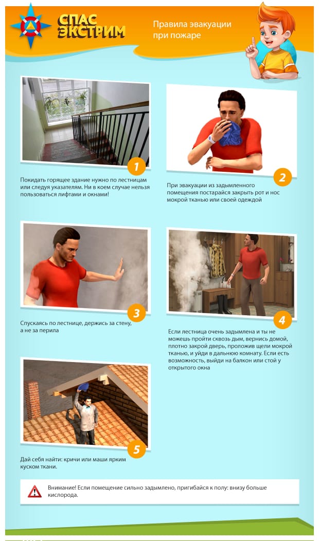 2. Эвакуация должна происходить еще до вызова пожарной службы. Требуется закрыть нос и рот влажной салфеткой, продвигаться ползком к выходу из помещения. Лифтом желательно не пользоваться, он может выключиться в самый неподходящий момент.