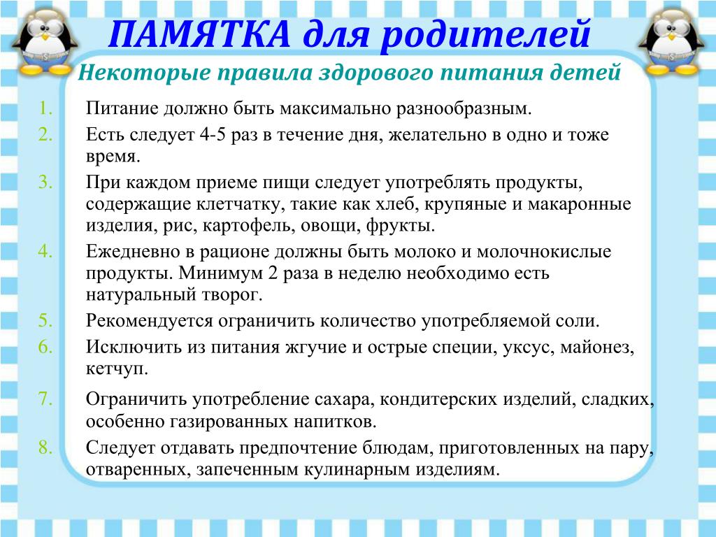 Краткая памятка для родителей по правилам здорового питания для детей: